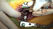 症例は雑種(ボクサー×ピットブル)、11歳3か月齢、体重25kg。 2年程前から寝起きにふらつきや尻もちをつく様子が見られていたが、その後進行し来院3か月前より右後肢の跛行、1カ月半前より負重に支障が生じはじめ、尿漏れや排便不良が生じてきたとの主訴で来院した症例です。来院時は起立がほぼ不能の状態、四肢の姿勢反応が消失しており、疼痛は認められませんでした。 頭頚部の精査を実施したところ頚髄に背側からの圧迫所見を認めたことから、大型犬である点を加味しスクリューロッド法による環軸椎固定と、環軸関節の軟骨切除および自家海綿骨の移植を実施しました。